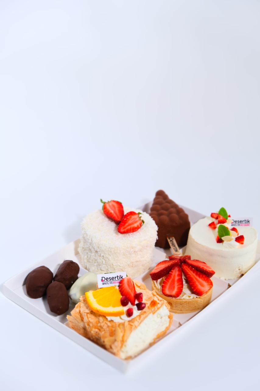 Черничный торт - 1 штМиндально-карамельный торт - 1 штМуссовый торт "Три Шоколада" - 1 штКешьюкейк - 1 штМедовик - 1 штШоколадно-ореховый - 1 штИспанский чизкейк - 1 штМеренговый рулет - 1 штТарталетка с ягодой - 1 шт